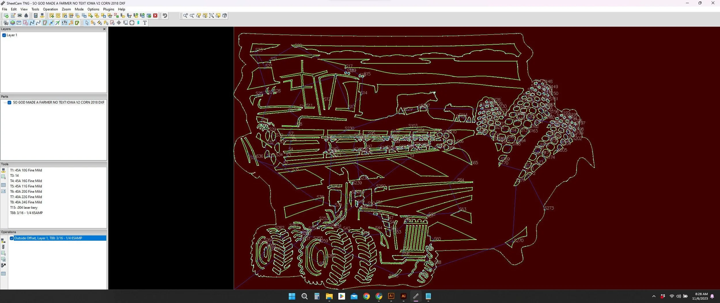 Introducing our Iowa sign laser cutting files for cnc, a detailed god made a farmer sign for metal. This farm and combine sign svg, tractor dxf for laser cutters file bundle includes svg jpg png dwg (r14 & 2018) and dxf files (r14 & 2018) for a full collection of file formats to suit your needs. These versatile cutting files are perfect for creating custom plasma cut ranch signs on your cnc machine and feature clean lines and minimal nodes; they have been sheetcam tested for tolerances.
